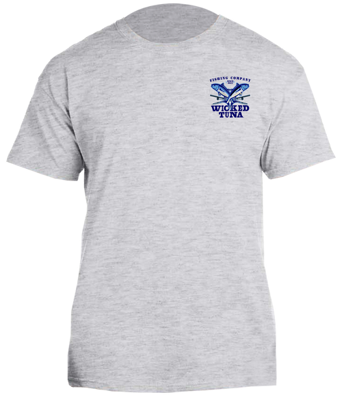 The crossed tunas tee is decorated with a design on the left chest and on the full back on a 100% preshrunk cotton shirt.