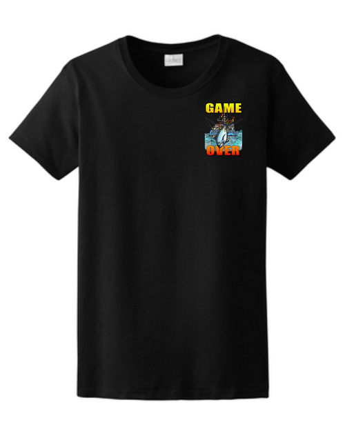 Description The New Game Over ladies t-shirts are printed on the left chest and full back on a 100% preshrunk cotton shirt.